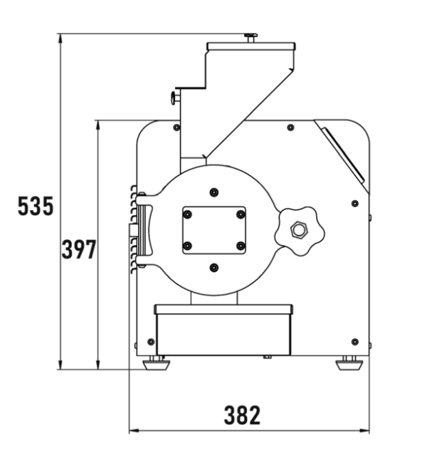 Pengisian bahan dilakukan melalui hopper (corong) di bagian atas dan dapat diatur secara manual menggunakan alat pemotong (chopper). Pintu alat dilengkapi sistem penguncian cepat serta sensor pengaman (safety micro-sensor) yang secara otomatis menghentikan rotasi ketika pintu dibuka.
