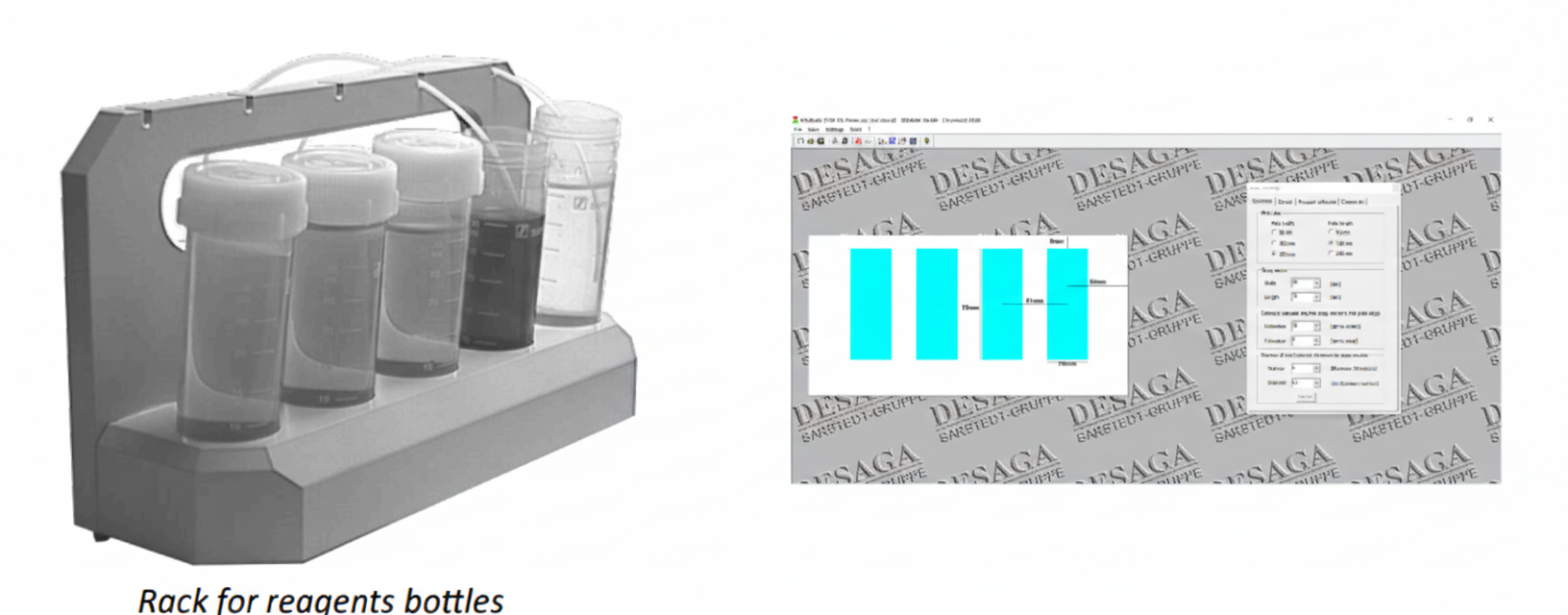 Compared with traditional manual spraying techniques, this device considerably reduces reagent consumption and achieves homogeneous medium , thanks to uniform dosing facilitated by the Teflon spray head.